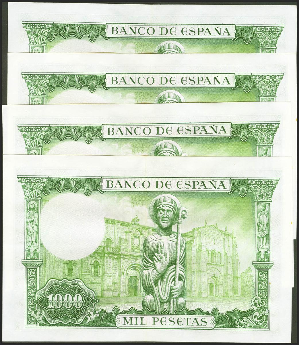 Conjunto de 4 billetes correlativos de 1000 Pesetas emitidos el 19 de Noviembre de 1965, todos ellos con la serie G (Edifil 2021: 471b), conservando gran parte del apresto original. EBC+/EBC.