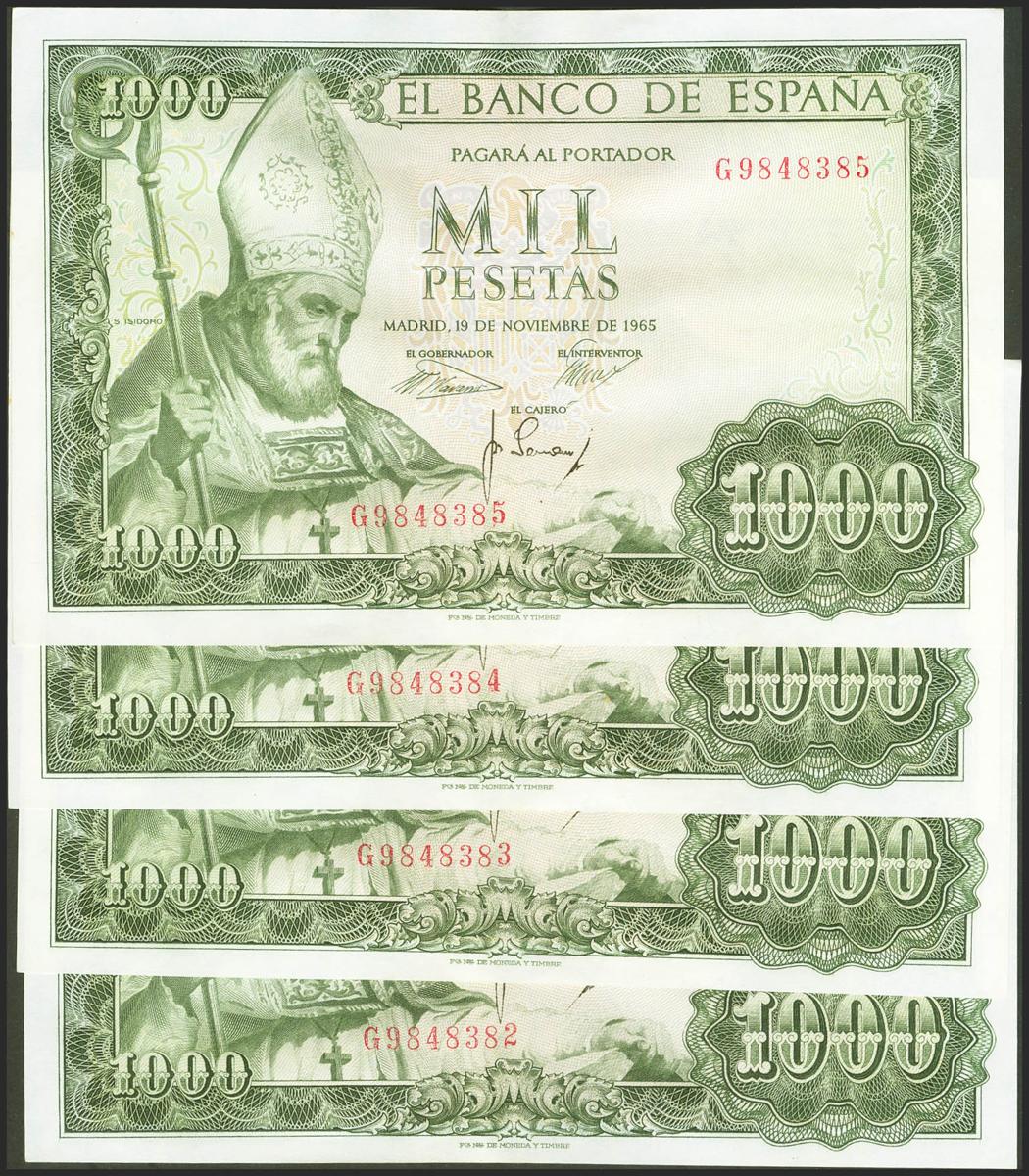 Conjunto de 4 billetes correlativos de 1000 Pesetas emitidos el 19 de Noviembre de 1965, todos ellos con la serie G (Edifil 2021: 471b), conservando gran parte del apresto original. EBC+/EBC.
