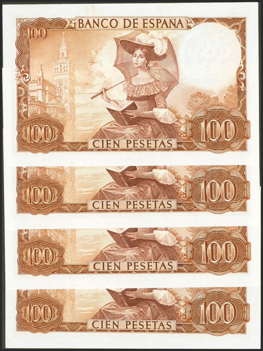 Conjunto de 4 billetes correlativos de 100 Pesetas emitidos el 19 de Noviembre de 1965, todos ellos con la serie A (Edifil 2021: 470a), conservando el apresto original. SC/SC-.