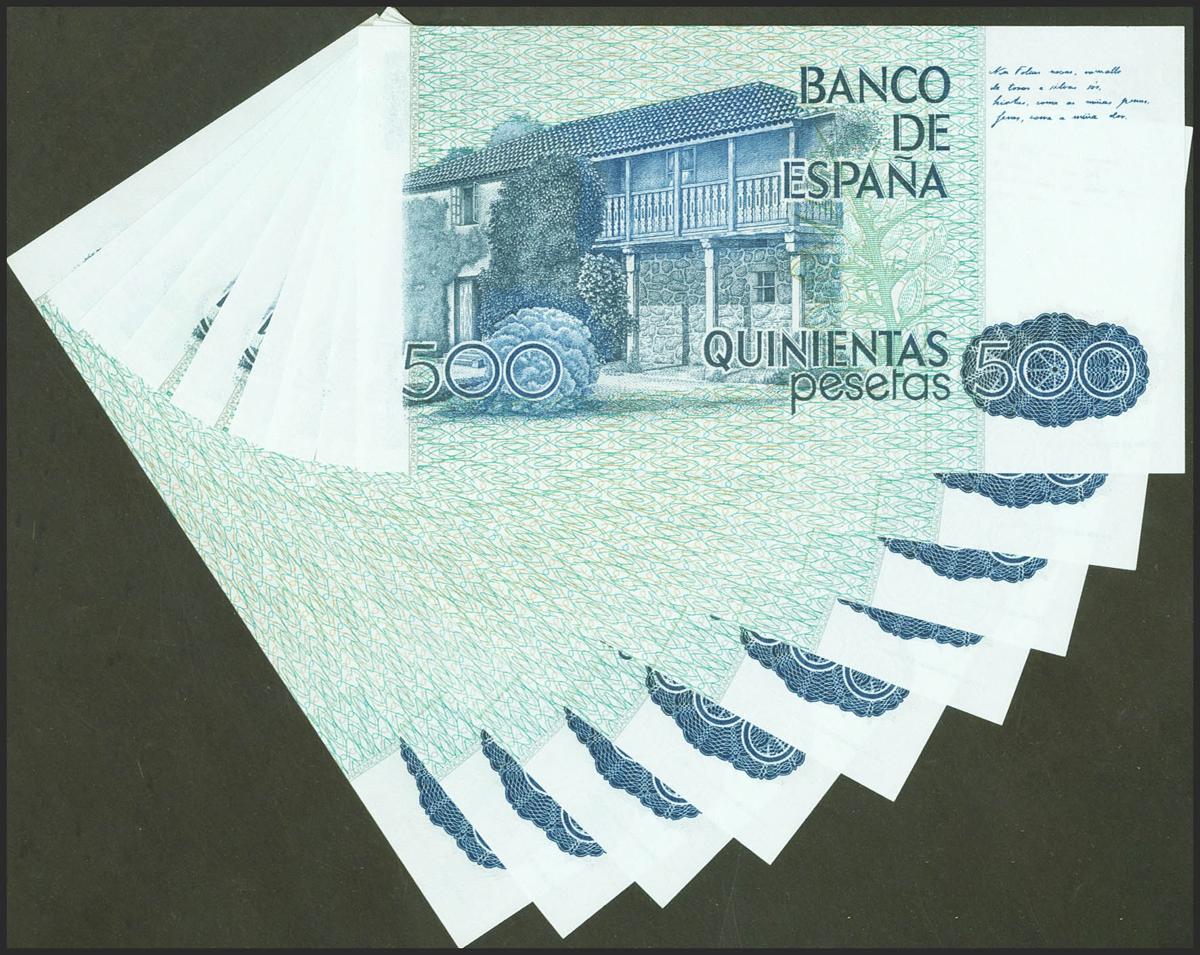 Conjunto de 9 billetes correlativos de 500 Pesetas emitidos el 23 de Octubre de 1979, todos ellos con la serie 1D (Edifil 2021: 476a). SC.