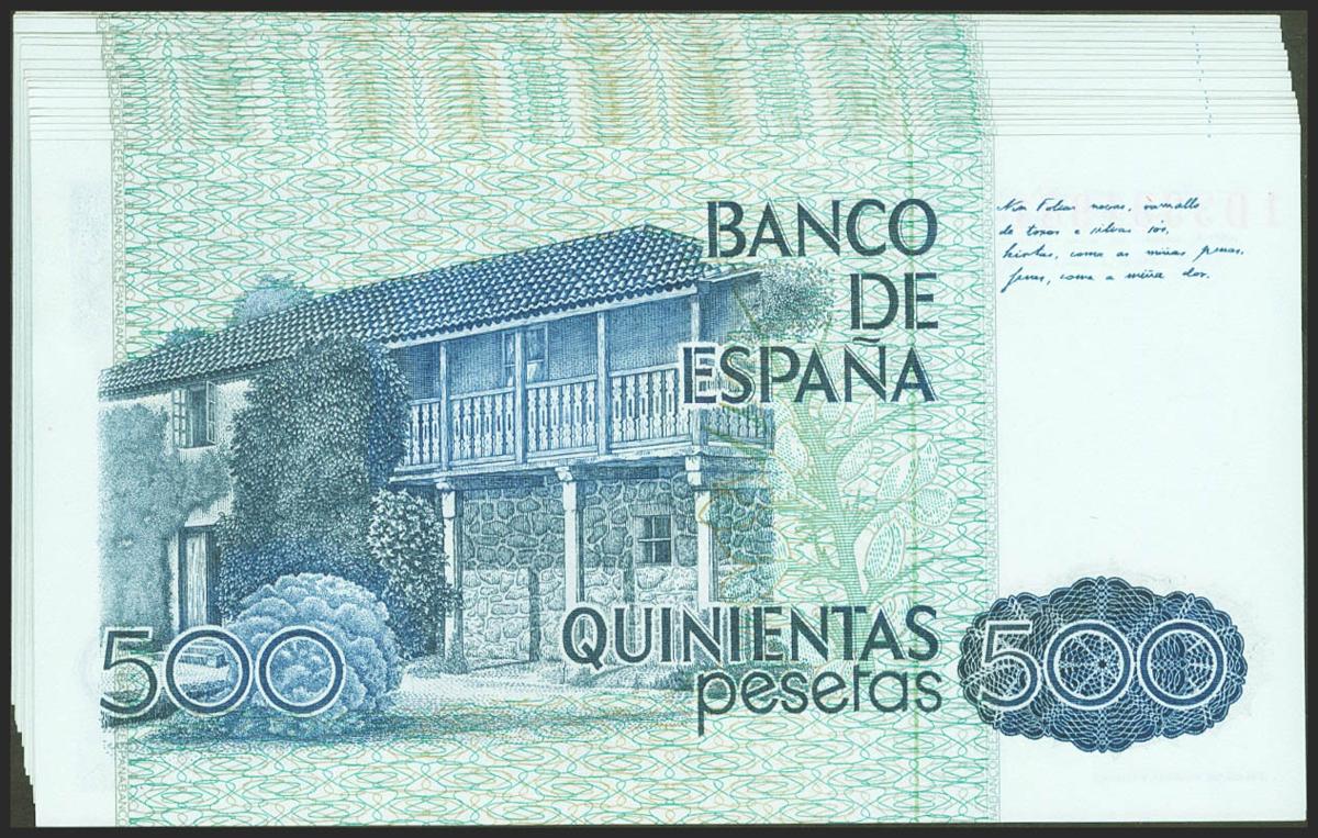 Conjunto de 18 billetes en dos tramos correlativos de 500 Pesetas emitidos 23 de Octubre de 1979, todos ellos con la serie 1D (Edifil 2021: 476a). SC.