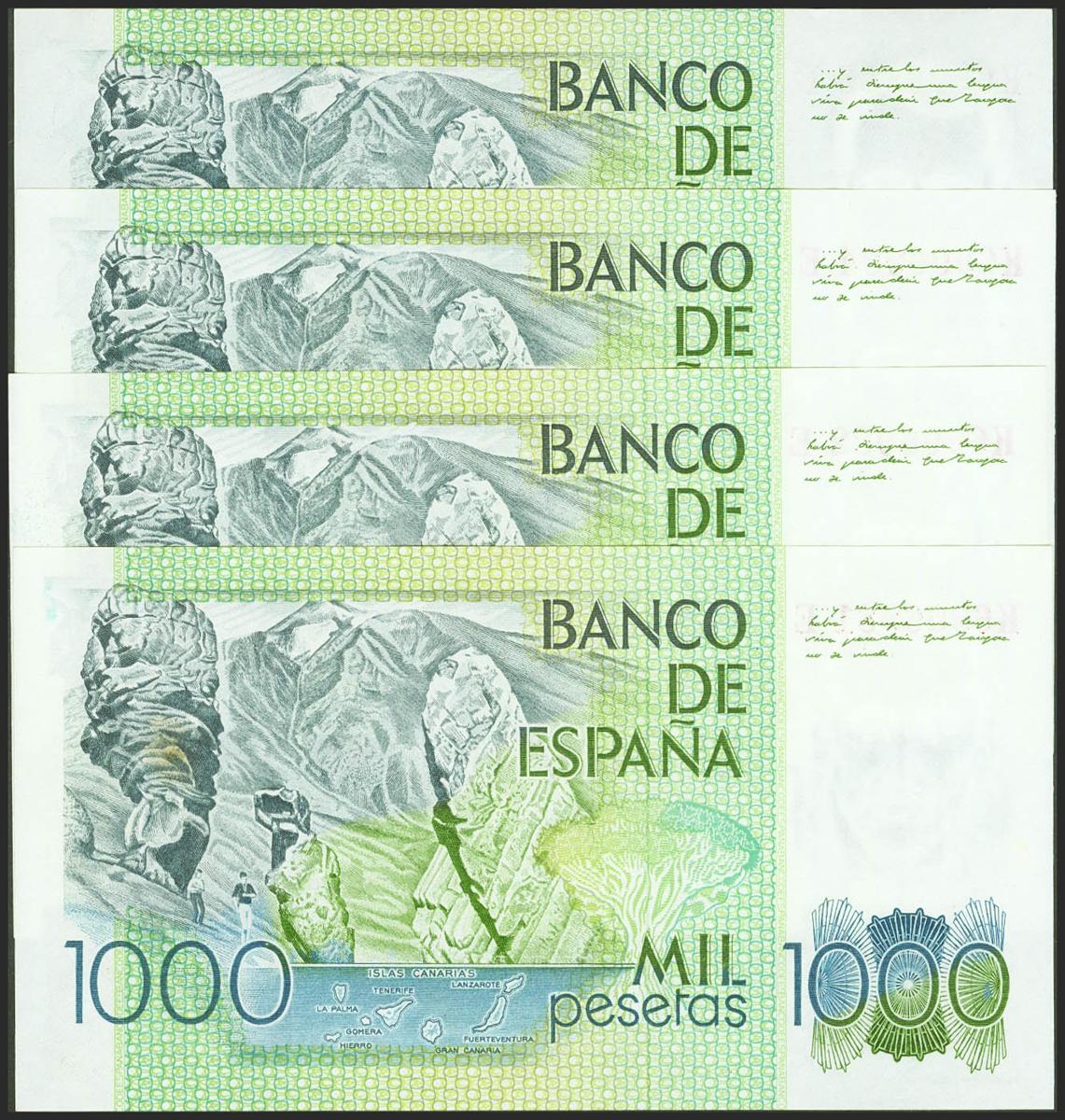Conjunto de 4 billetes, incluyendo dos parejas, de 1000 Pesetas emitidos el 23 de Octubre de 1979, todos ellos con la serie K-E (Edifil 2021: 477a). SC.