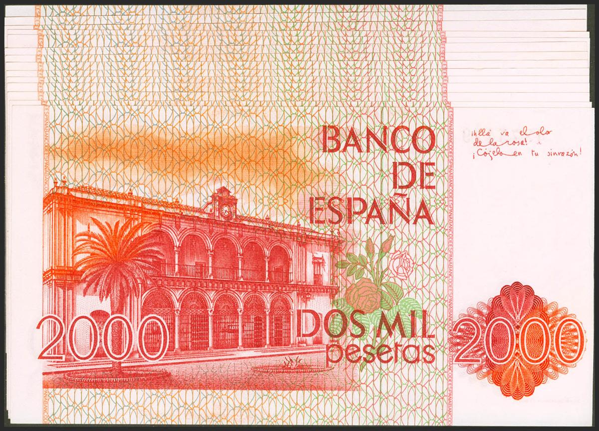 Conjunto de 14 billetes en tramos correlativos de 2000 Pesetas emitidos el 22 de Julio de 1980, todos ellos sin serie (Edifil 2021: 479). SC/SC-.