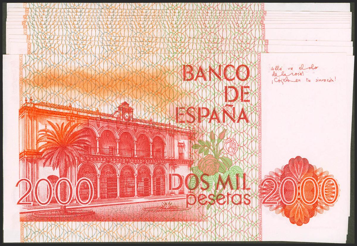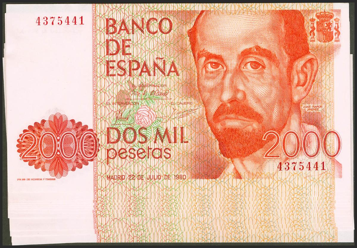 Conjunto de 12 billetes en dos tramos correlativos de 2000 Pesetas emitidos el 22 de Julio de 1980, todos ellos sin serie (Edifil 2021: 479). SC/SC--.
