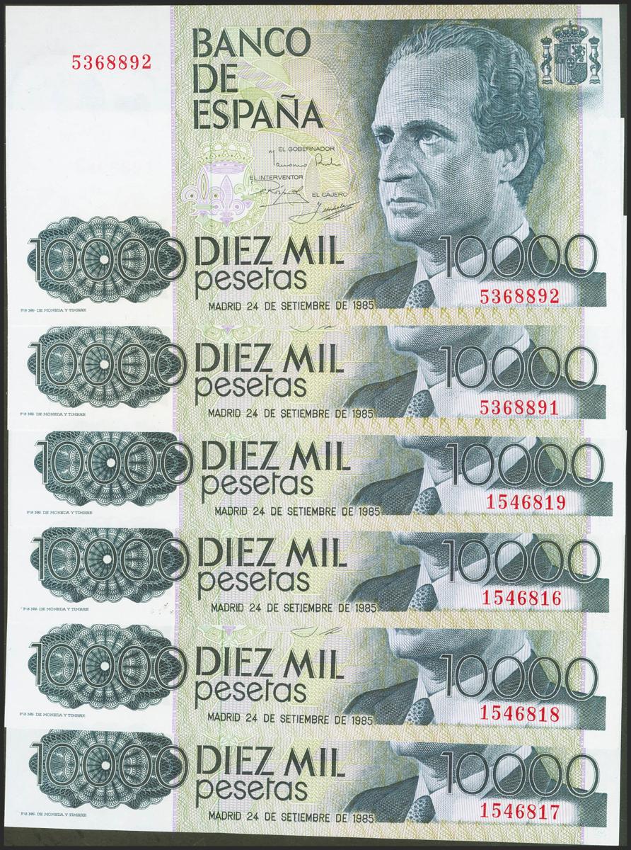 Conjunto de 6 billetes correlativos además de una pareja de 10000 Pesetas emitidos el 24 de Septiembre de 1985 y sin serie (Edifil 2021: 481). SC/SC-.