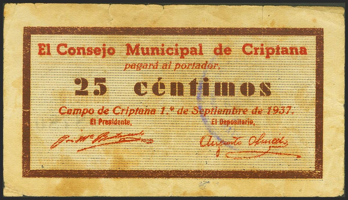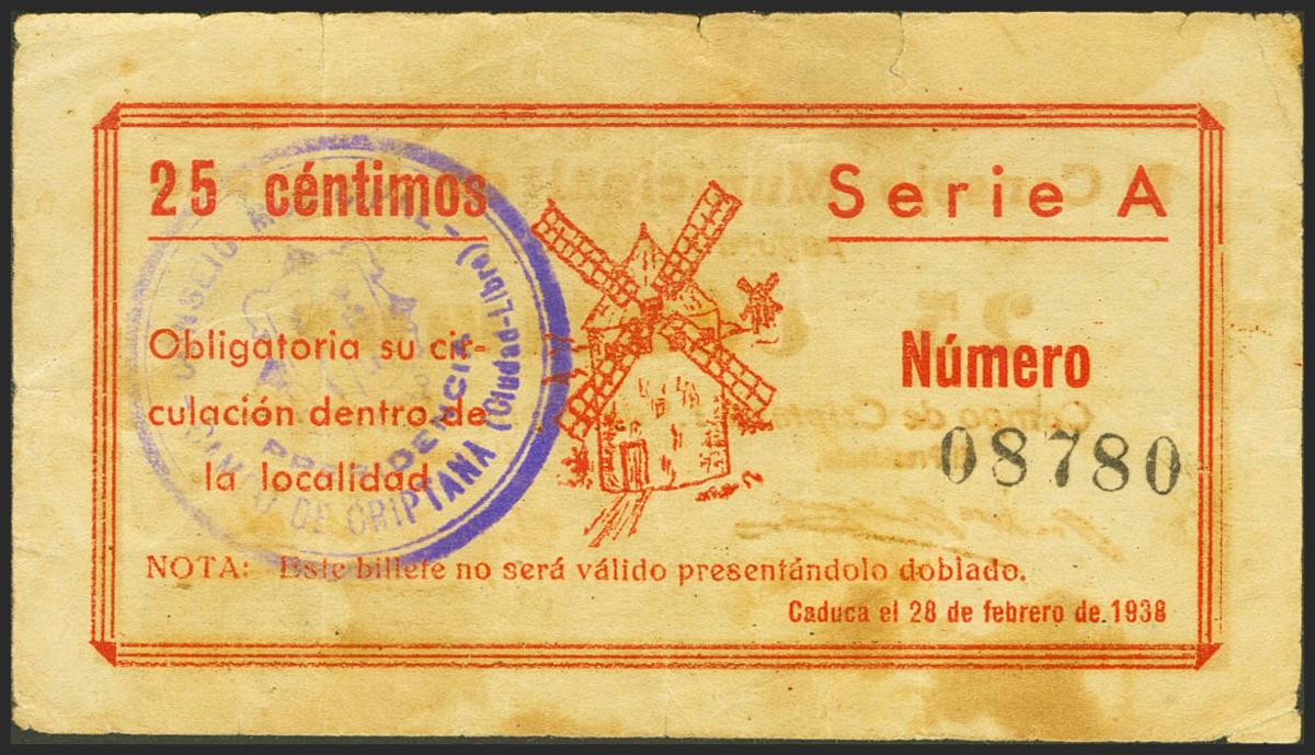 CRIPTANA (CIUDAD REAL). 25 Céntimos. 1 de Junio de 1937. Serie A. (González: 2096). MBC-.