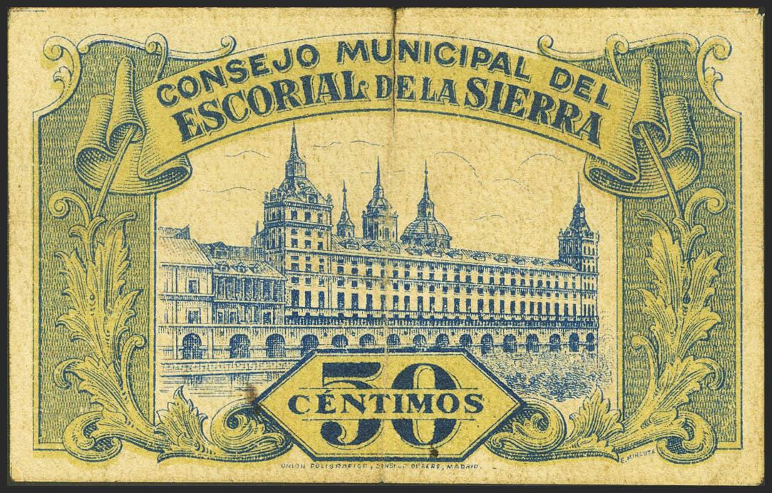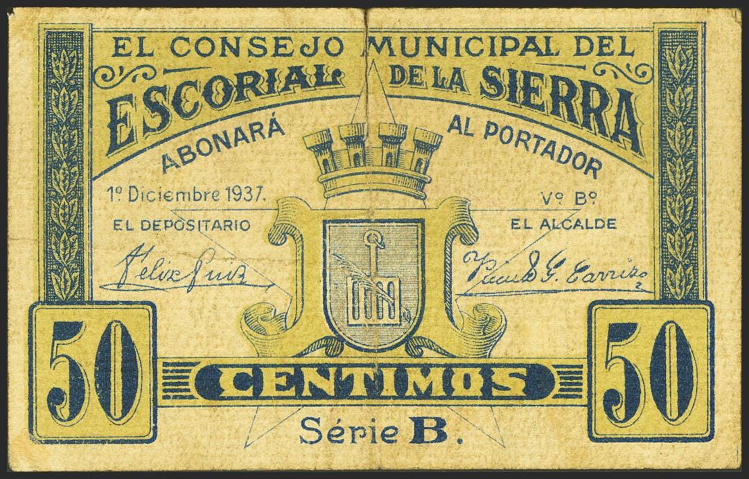 EL ESCORIAL DE LA SIERRA (MADRID). 50 Céntimos. 1 de Diciembre de 1937. Serie B. (González: 2325). MBC-.