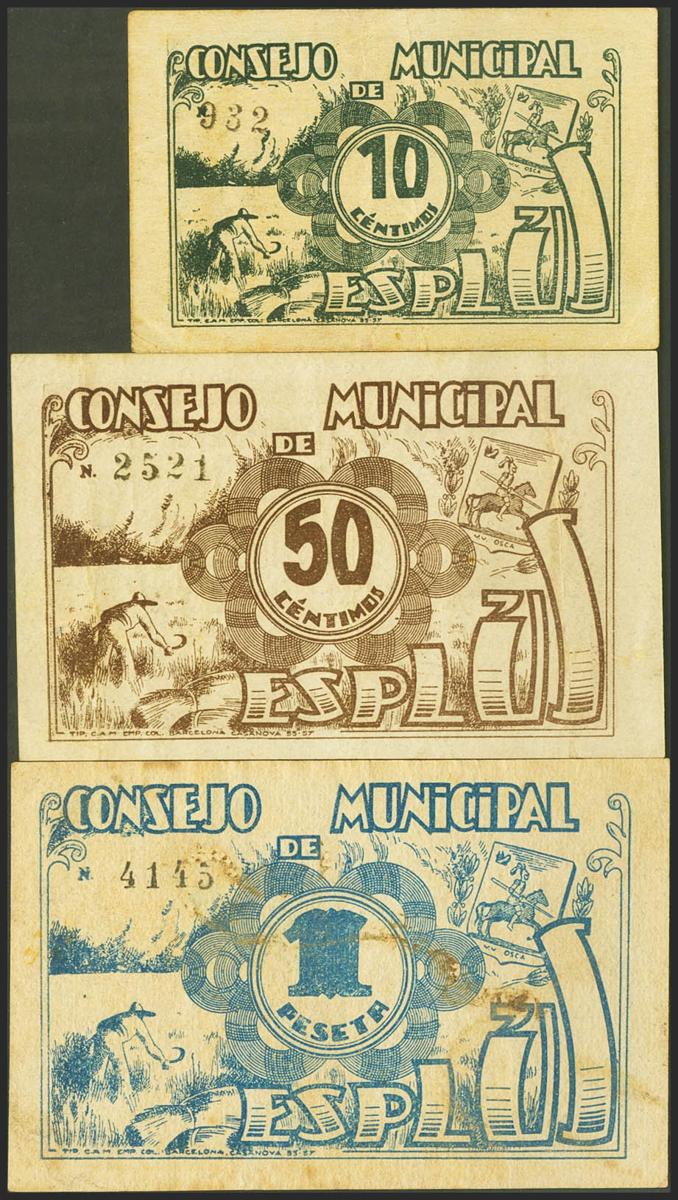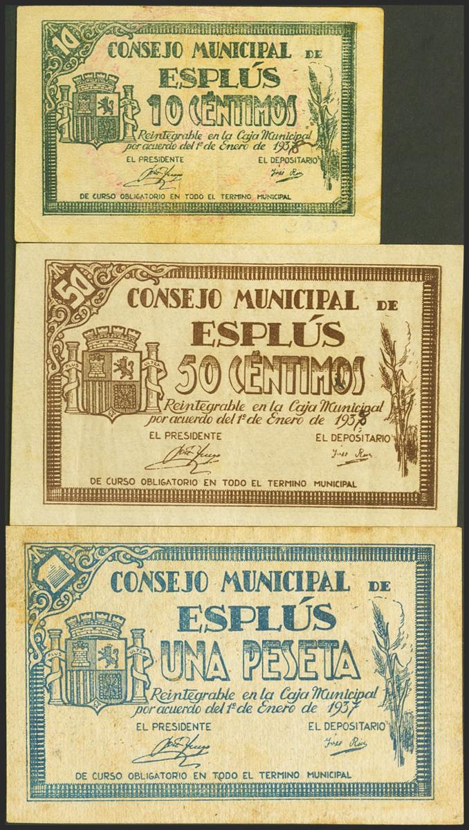 ESPLUS (HUESCA). 10 Céntimos, 50 Céntimos y 1 Peseta. 1 de Enero de 1938. (González: 2344, 2346, 2347). MBC.