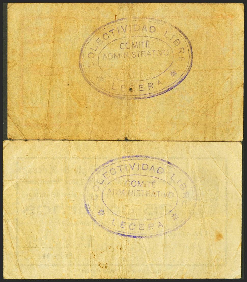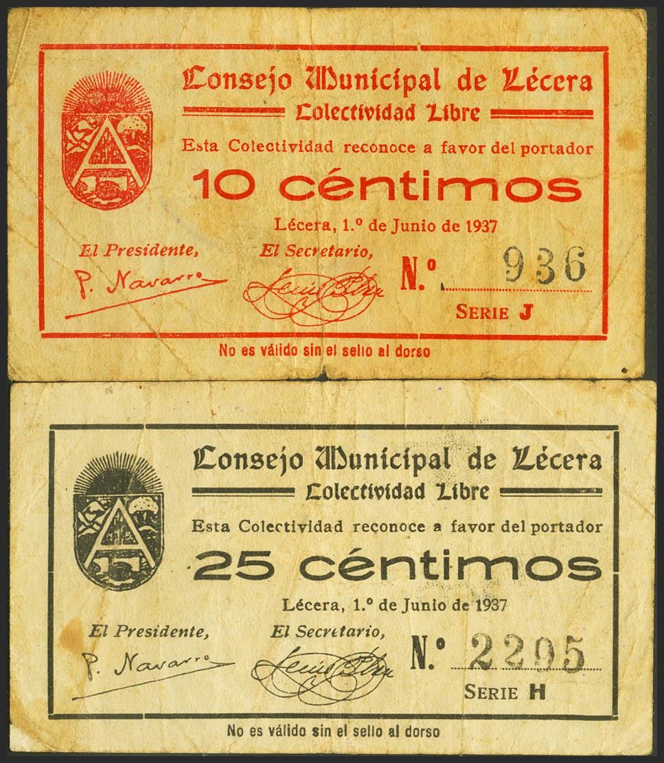 LECERA (ZARAGOZA). 10 Céntimos y 25 Céntimos. 1 de Junio de 1937. Series J y H, respectivamente. (González: 3121, 3123). MBC-.