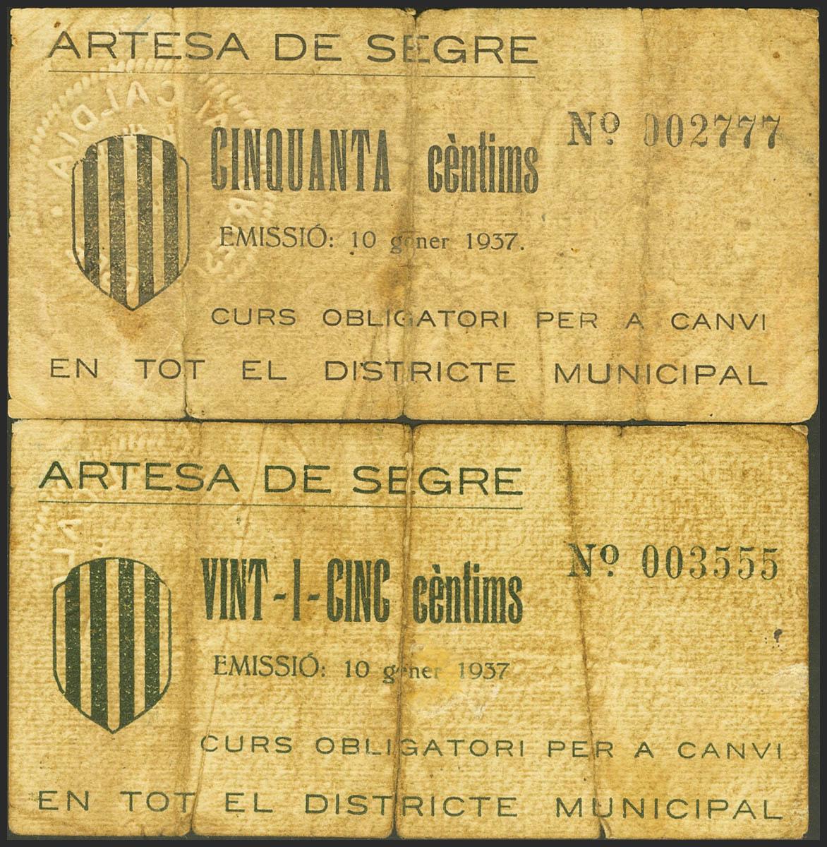 ARTESA DE SEGRE (LERIDA). 25 Céntimos y 50 Céntimos. 10 de Enero de 1937. (González: 6428, 6429). Raros. BC.