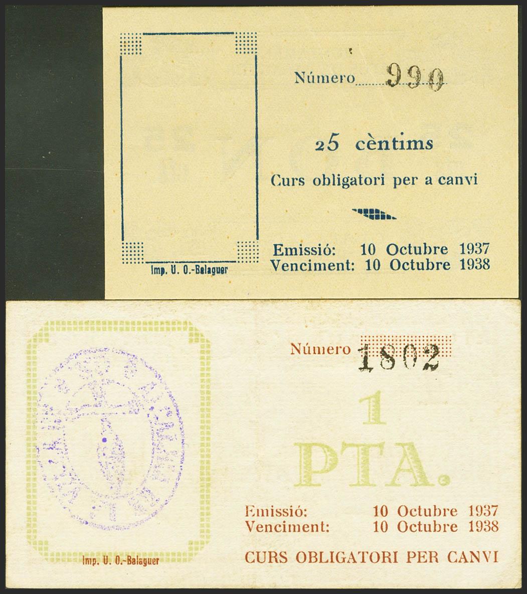 OS DE BALAGUER (LERIDA). 25 Céntimos y 1 Peseta. 10 de Octubre de 1937. (González: 9052, 9054). Raros. SC/EBC.