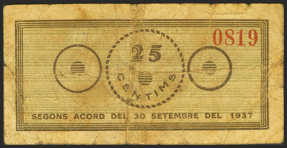 PORRERA (TARRAGONA). 25 Céntimos. 30 de Septiembre de 1937. (González: 9402). Raro. MBC.