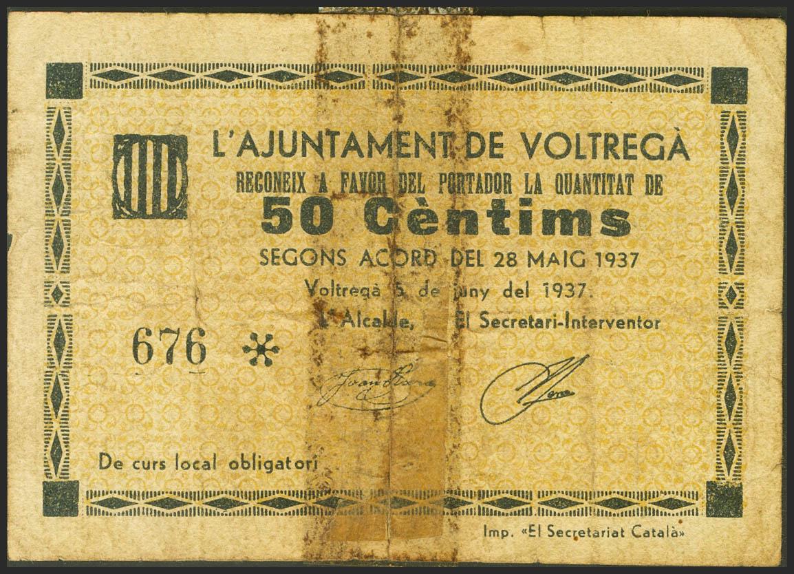VOLTREGA (BARCELONA). 50 Céntimos. 5 de Junio de 1937. (González: 10919). Presencia de cinta adhesiva. BC-.