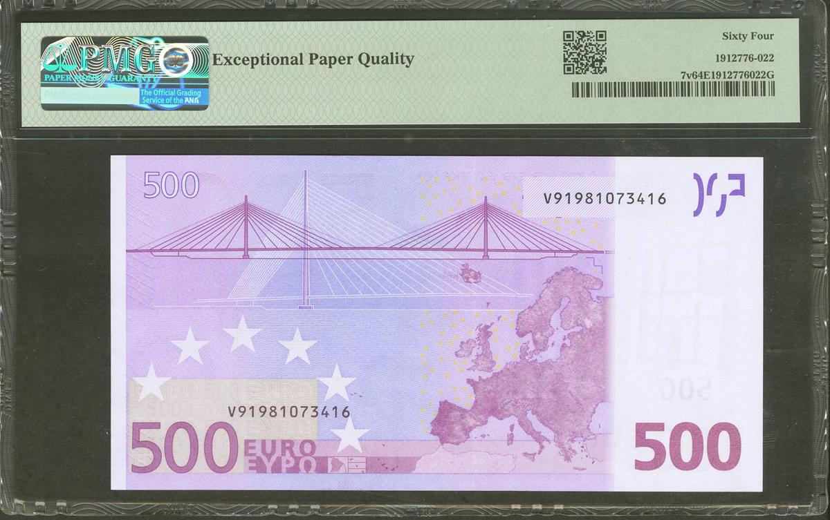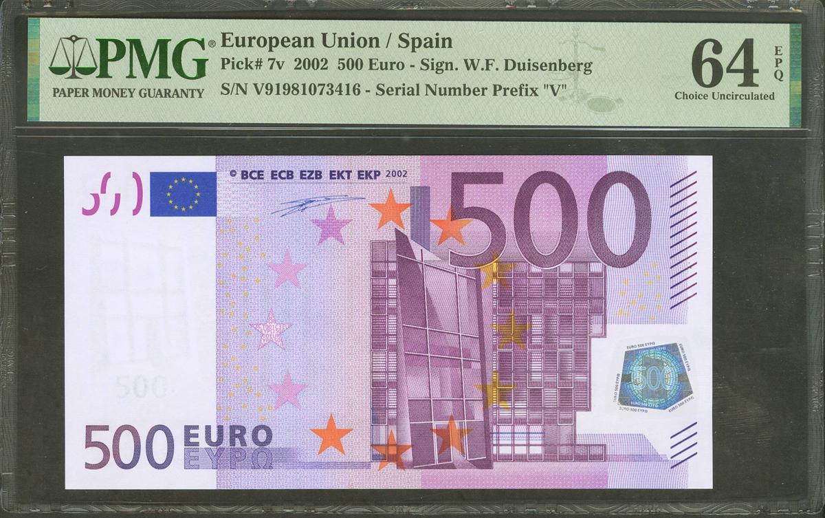 500 Euros. 1 de Enero de 2002. Firma Duisenberg. Serie V (España). (Edifil 2021: 492, Pick: 7v). SC. Encapsulado PMG64EPQ.