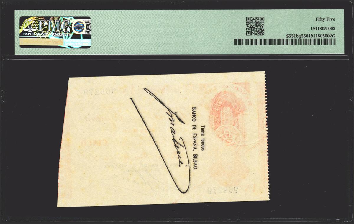 5 Pesetas. 30 de Agosto de 1936. Sucursal de Bilbao, antefirma del Banco de Vizcaya. Serie A. (Edifil 2021: 368Aa, Pick: S551bg). Inusual en esta excepcional calidad. EBC+. Encapsulado PMG55.
