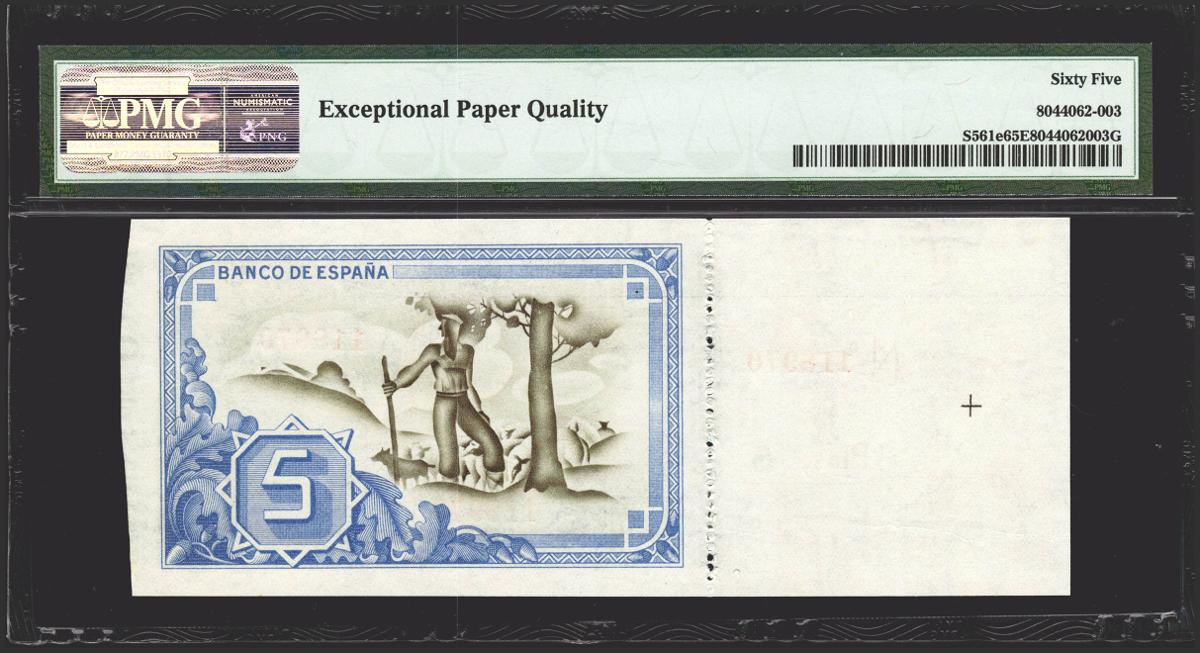 5 Pesetas. 1 de Enero de 1937. Serie A y antefirma Banco Urquijo Vascongado, matriz a la izquierda. (Edifil 2021: 386f, Pick: S561e). Apresto original. SC. Encapsulado PMG65EPQ.