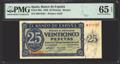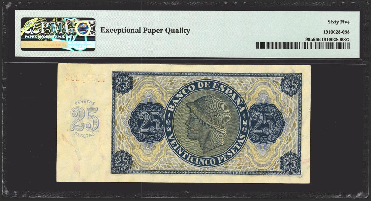 25 Pesetas. 21 de Noviembre de 1936. Serie M. (Edifil 2021: 419a, Pick: 99a). Inusual en esta excepcional calidad, apresto original. Encapsulado PMG65EPQ.