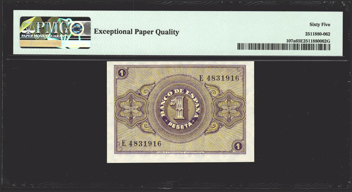 1 Peseta. 28 de Febrero de 1938. Serie E. (Edifil 2021: 427a, Pick: 107a). Apresto original. SC. Encapsulado PMG65EPQ.