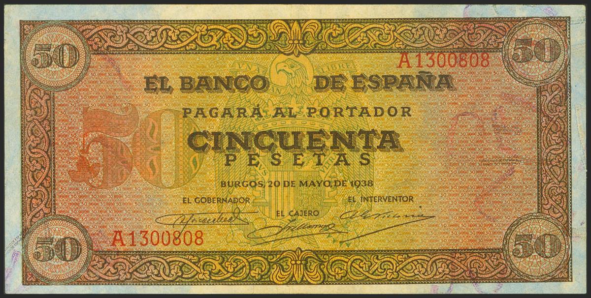 50 Pesetas. 20 de Mayo de 1938. Serie A. (Edifil 2021: 431). Conserva parte del apresto original. EBC+.