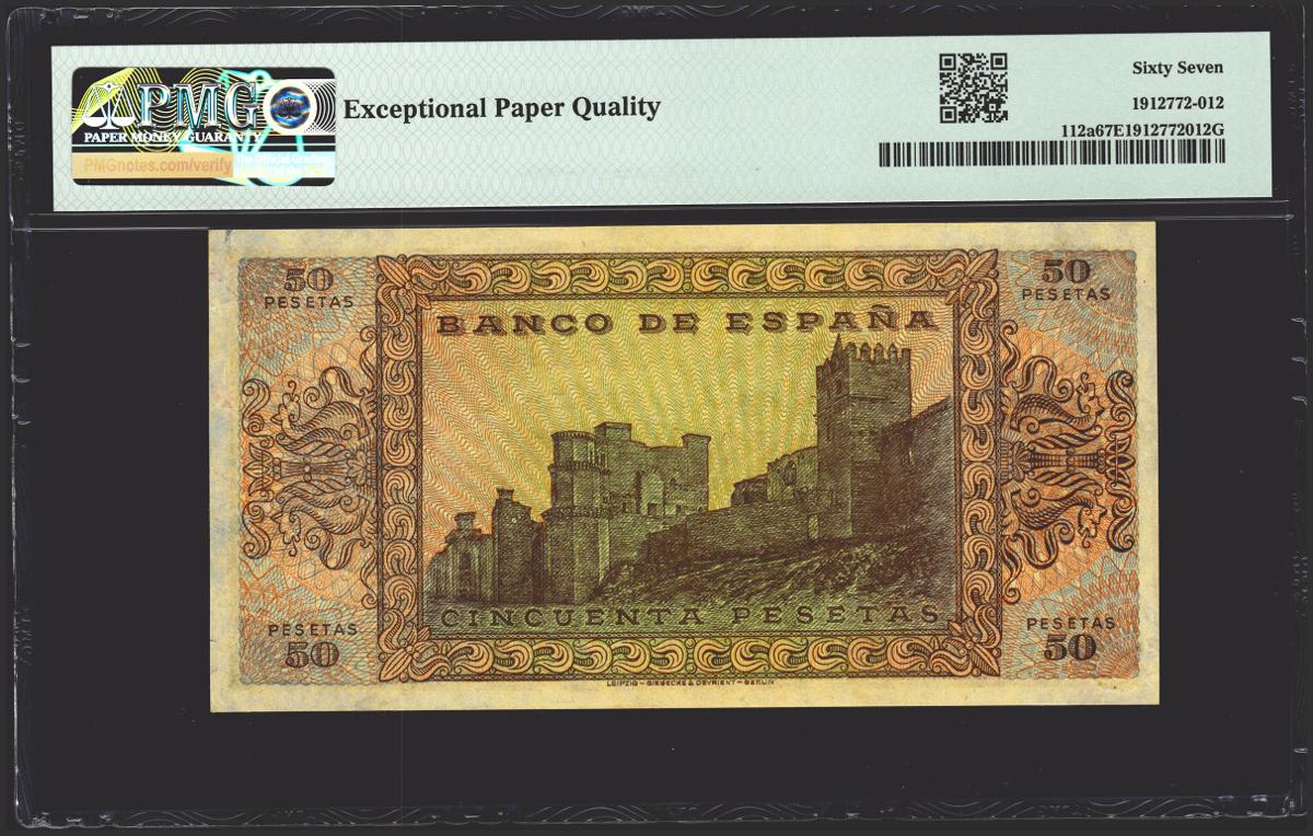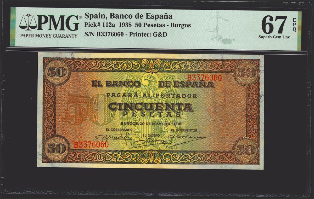 50 Pesetas. 20 de Mayo de 1938. Serie B. (Edifil 2021: 431a, Pick: 112a). Rarísimo en esta calidad, apresto original. SC. Encapsulado PMG67EPQ. (para hacernos idea de la rareza, a fecha 1 de Marzo 2023, este billete es el mejor calificado junto a otros cinco billetes en PMG)