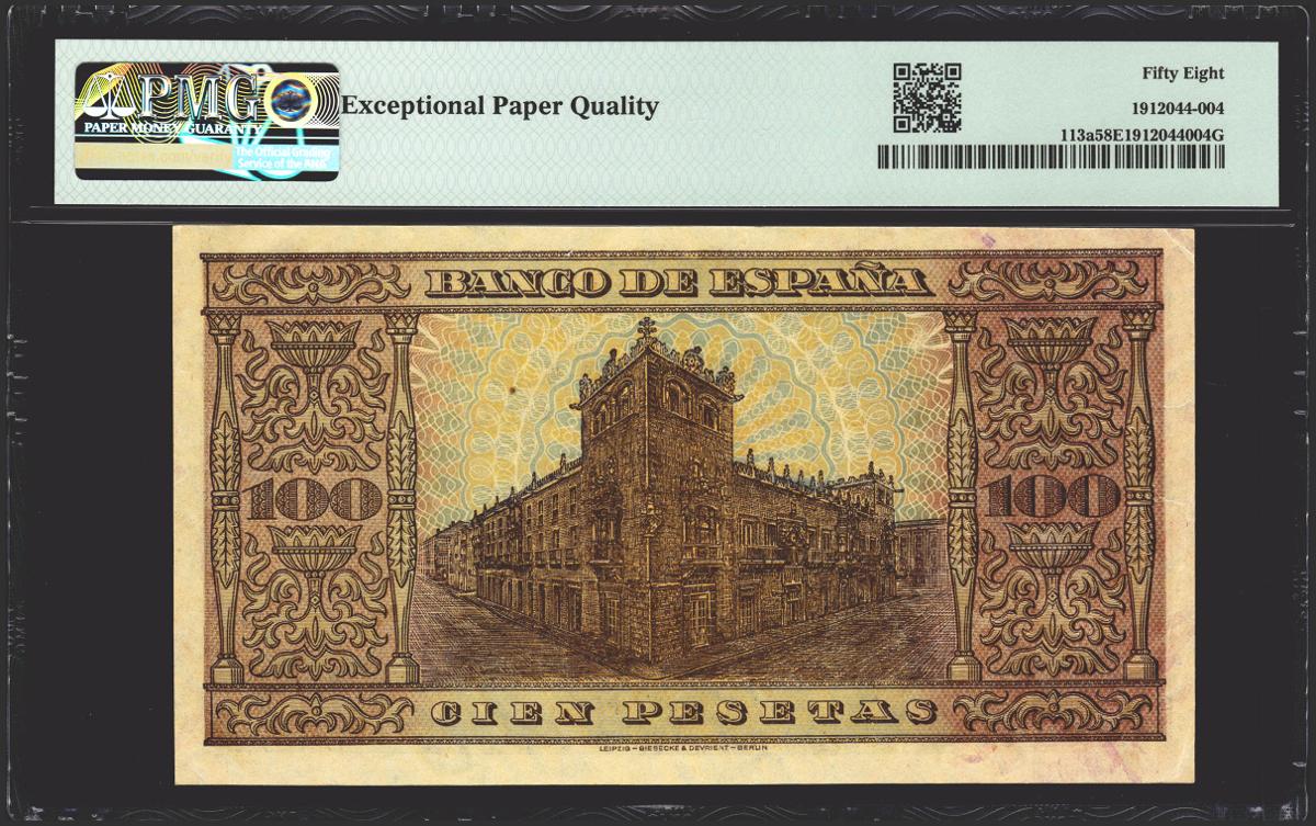 100 Pesetas. 20 de Mayo de 1938. Serie H, última serie emitida. (Edifil 2021: 432a). Apresto original. EBC+++. Encapsulado PMG58EPQ.