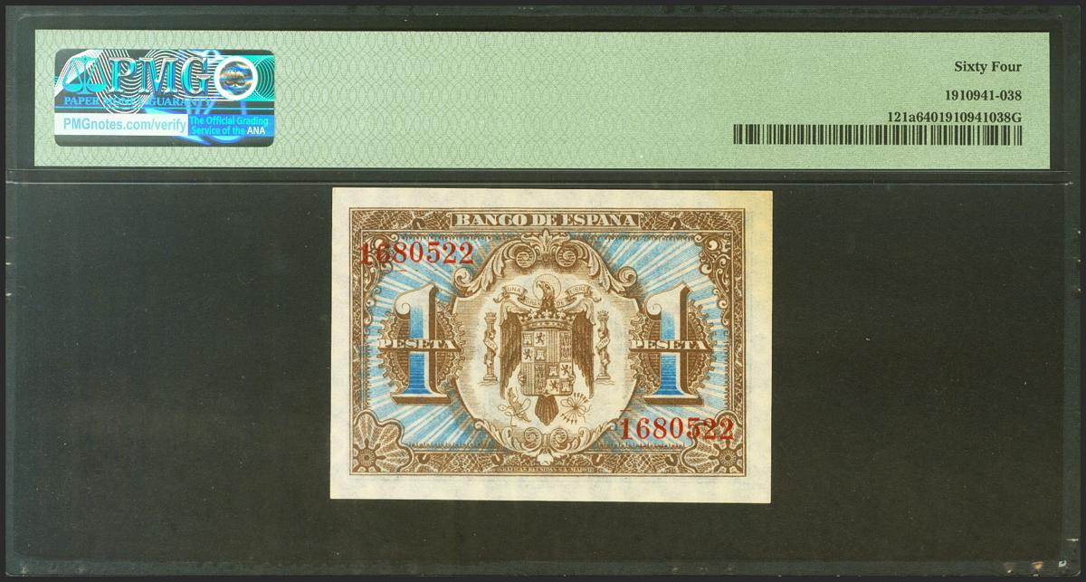 1 Peseta. 1 de Junio de 1940. Sin serie. (Edifil 2021: 441, Pick: 121a). Inusual. SC. Encapsulado PMG64.