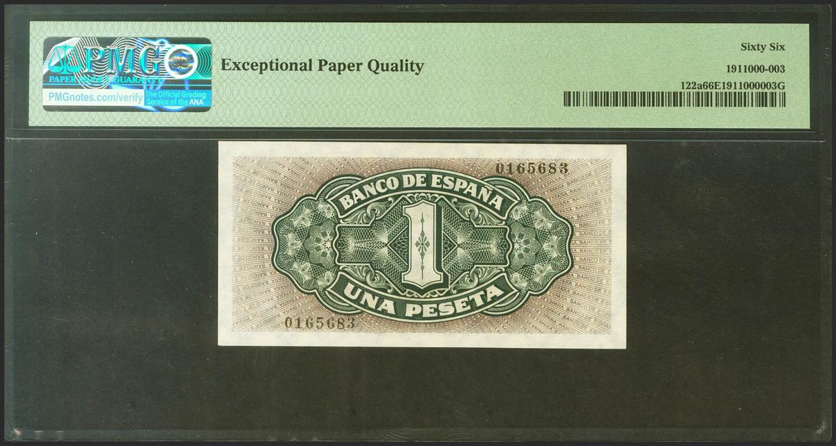 1 Pesetas. 4 de Septiembre de 1940. Sin serie. (Edifil 2021: 442, Pick: 122a). Inusual en esta calidad, apresto original. SC. Encapsulado PMG66EPQ.