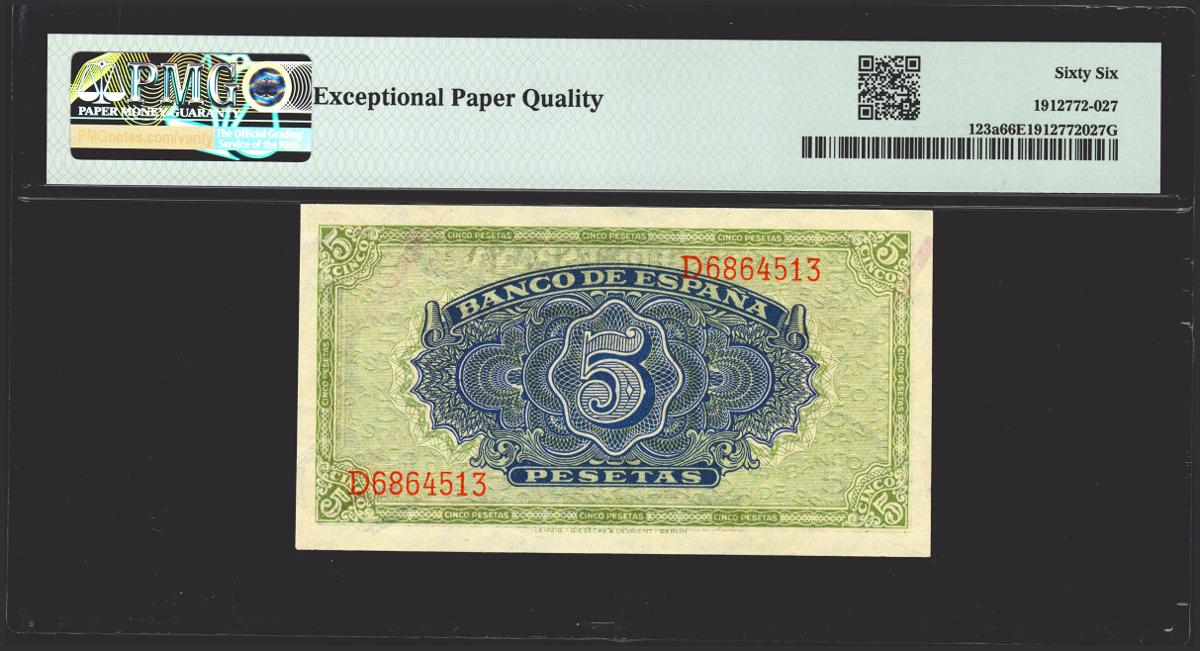 5 Pesetas. 4 de Septiembre de 1940. Serie D. (Edifil 2021: 443a, Pick: 123a). Raro en esta excepcional calidad, apresto original. SC. Encapsulado PMG66EPQ.