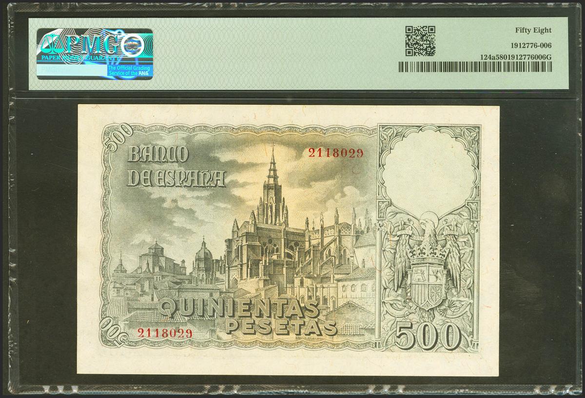 500 Pesetas. 21 de Octubre de 1940. Sin serie. (Edifil 2021: 444, Pick: 124a). Inusual en esta excepcional calidad. EBC++. Encapsulado PMG58.