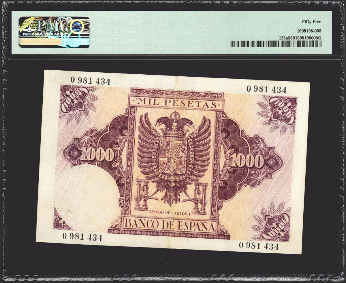1000 Pesetas. 21 de Octubre de 1940. Sin serie. (Edifil 2021: 445, Pick: 125a). Inusual en esta calidad. EBC+. Encapsulado PMG55.