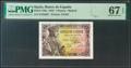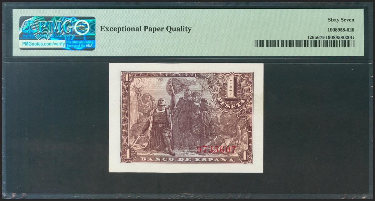 1 Pesetas. 21 de Mayo de 1943. Sin serie. (Edifil 2021: 447, Pick: 126a). Raro en esta calidad, apresto original. SC. Encapsulado PMG67EPQ.