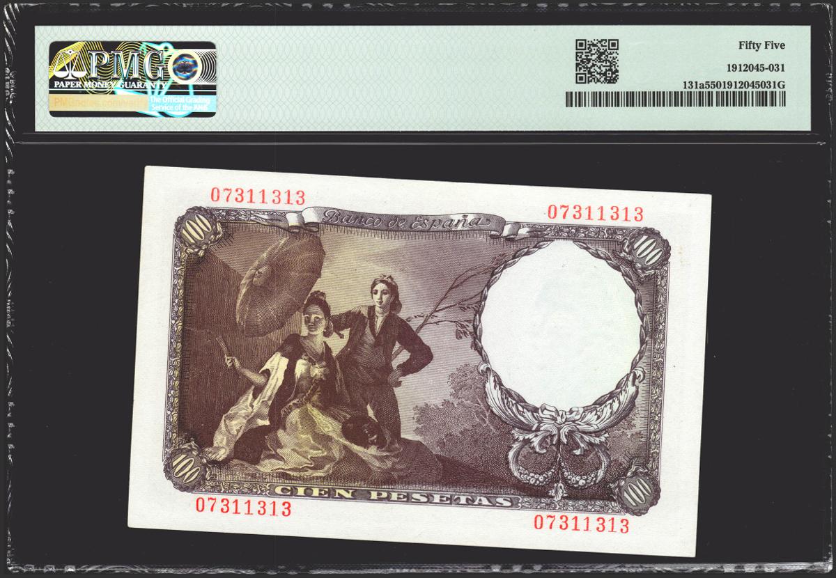 100 Pesetas. 19 de Febrero de 1946. Sin serie. (Edifil 2021: 451, Pick: 131a). EBC+. Encapsulado PMG55.