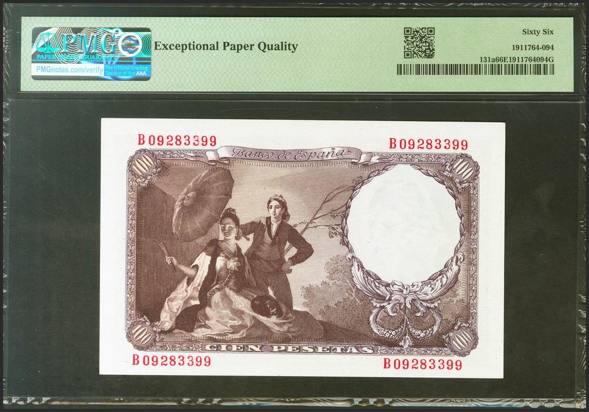 100 Pesetas. 19 de Febrero de 1946. Serie B. (Edifil 2021: 451b, Pick: 131a). Inusual en esta excepcional calidad, apresto original. SC. Encapsulado PMG66EPQ.