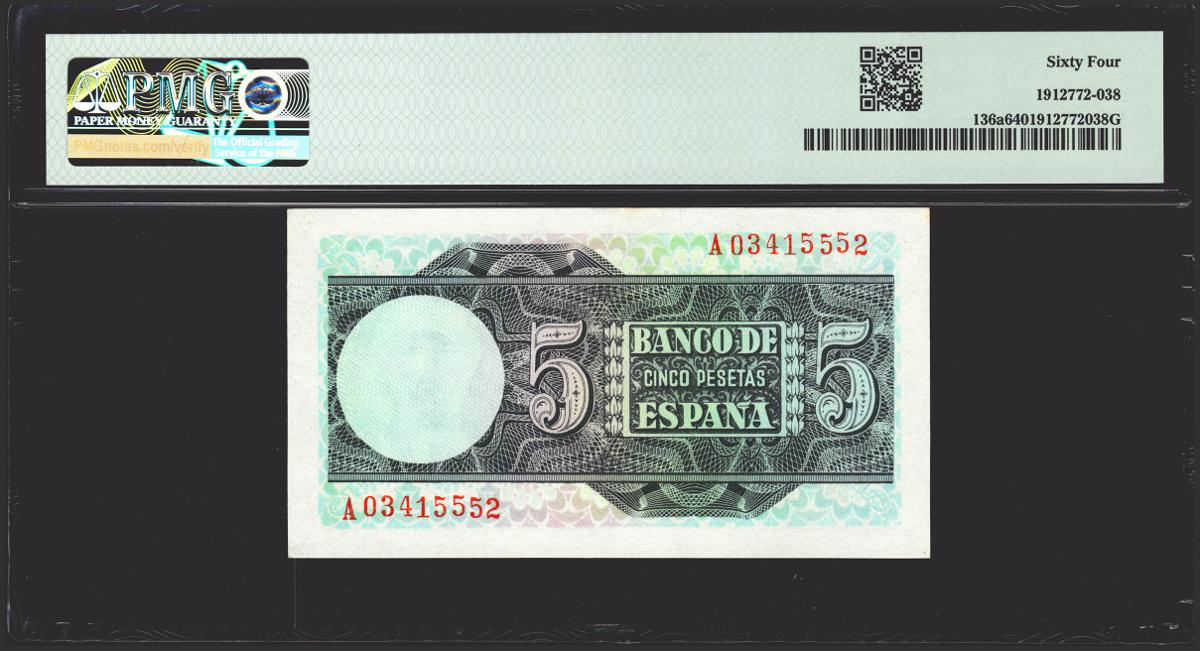 5 Pesetas. 5 de Marzo de 1948. Serie A. (Edifil 2021: 455a, Pick: 136a). SC. Encapsulado PMG64.