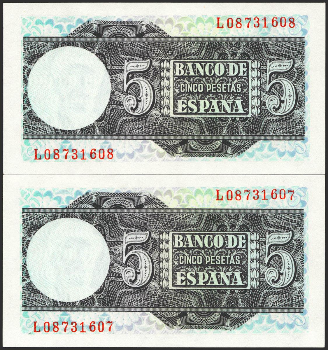 5 Pesetas. 5 de Marzo de 1948. Pareja correlativa. Serie L. (Edifil 2021: 455a). Apresto original. SC.