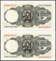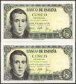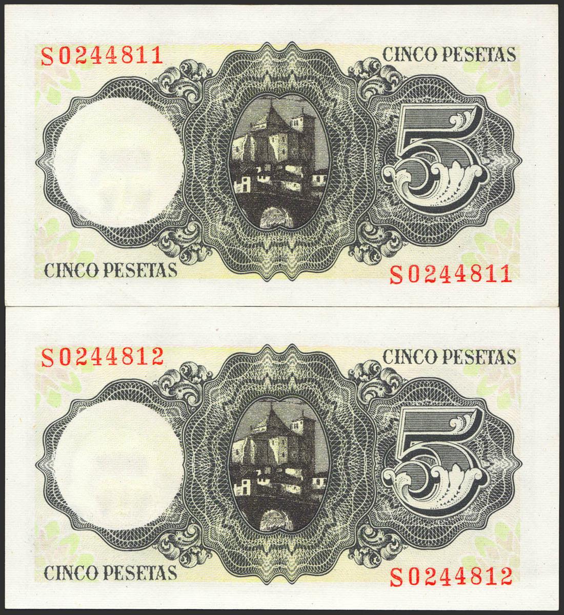 5 Pesetas. 16 de Agosto de 1951. Pareja correlativa. Serie S. (Edifil 2021: 459a). Apresto original. SC-.