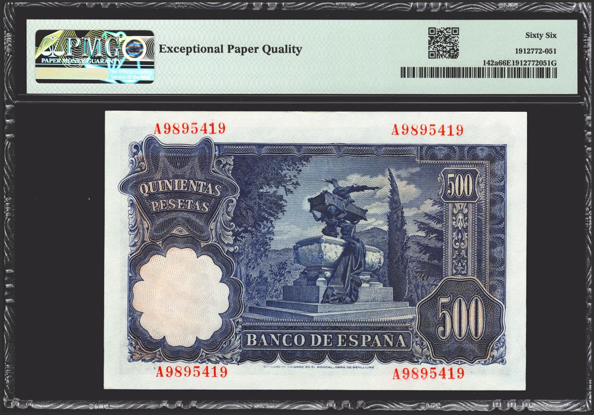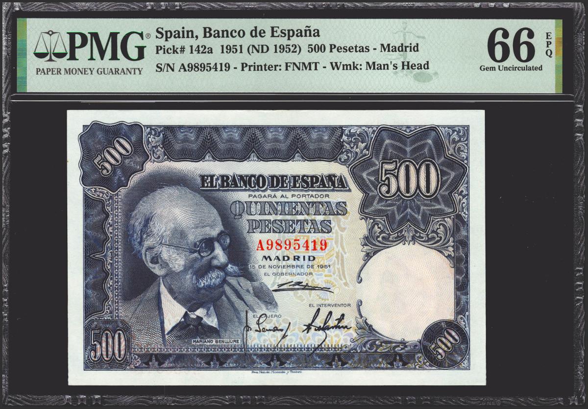 500 Pesetas. 15 de Noviembre de 1951. Serie A. (Edifil 2021: 460a, Pick: 142a). Rarísimo en esta excepcional calidad, apresto original. SC. Encapsulado PMG66EPQ.