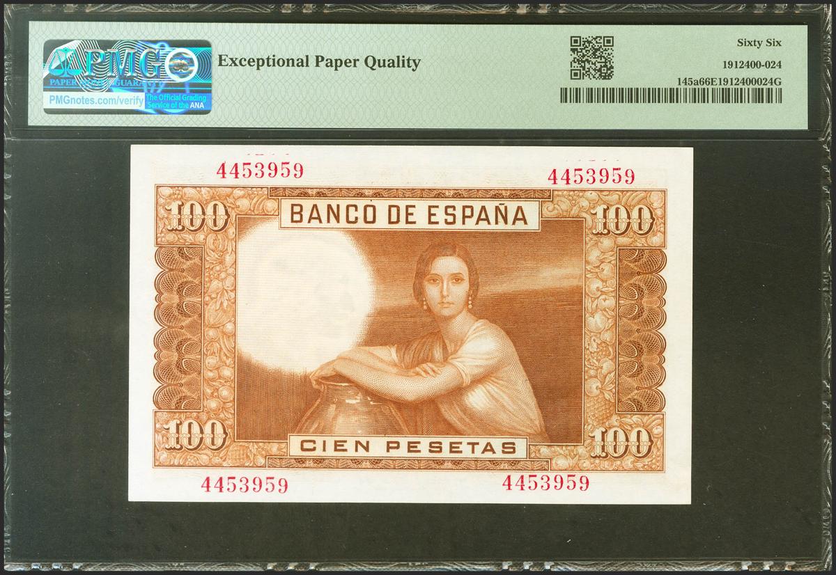 100 Pesetas. 7 de Abril de 1953. Sin serie. (Edifil 2021: 464, Pick: 145a). Raro en esta excepcional calidad, apresto original. SC. PMG66EPQ.