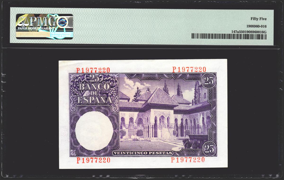 25 Pesetas. 22 de Julio de 1953. Serie P. (Edifil 2021: 467b, Pick: 147a). Muy rara serie, especialmente en esta muy aceptable calidad. EBC+. Encapsulado PMG55.