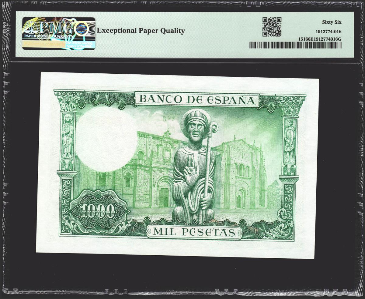 1000 Pesetas. 19 de Noviembre de 1965. Serie Y. (Edifil 2021: 471b, Pick: 151). Muy raro en esta excepcional calidad, apresto original. SC. Encapsulado PMG66EPQ.