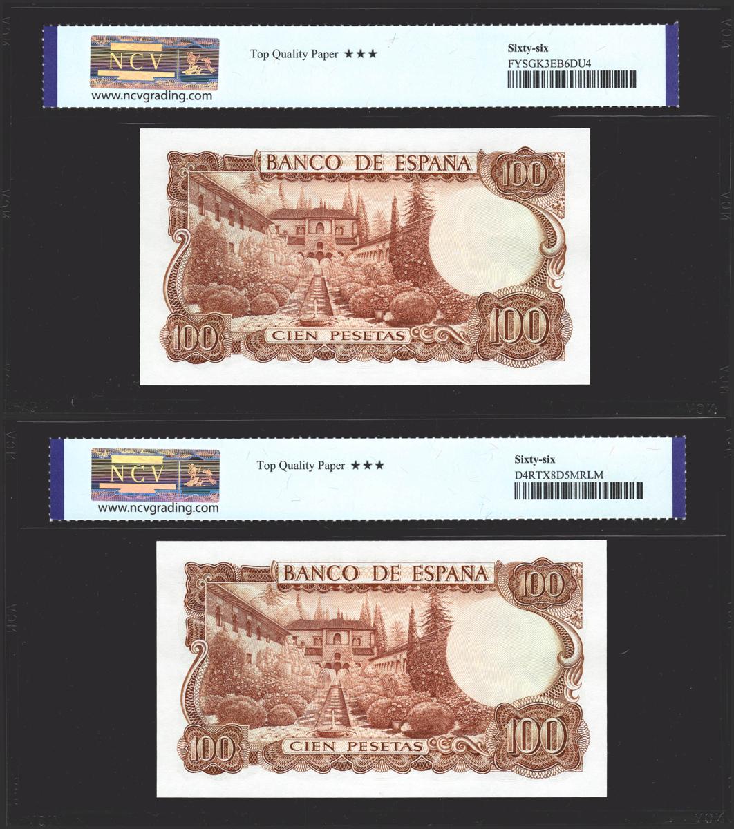 100 Pesetas. 17 de Noviembre de 1970. Pareja correlativa. Serie especial 9A. (Edifil 2021: 472d, Pick: 152a*). Rara en esta excepcional calidad, apresto original. SC. Encapsulados NCV66TQP, ambos.