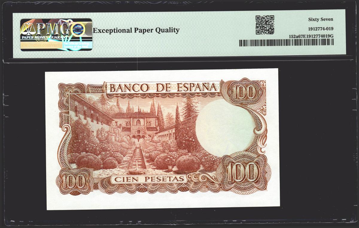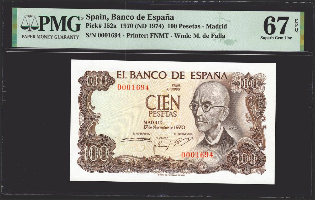 100 Pesetas. 17 de Noviembre de 1970. Sin serie y numeración bajísima. (Edifil 2021: 472, Pick: 152a). Raro en esta excepcional calidad, apresto original. SC. Encapsulado PMG67EPQ.