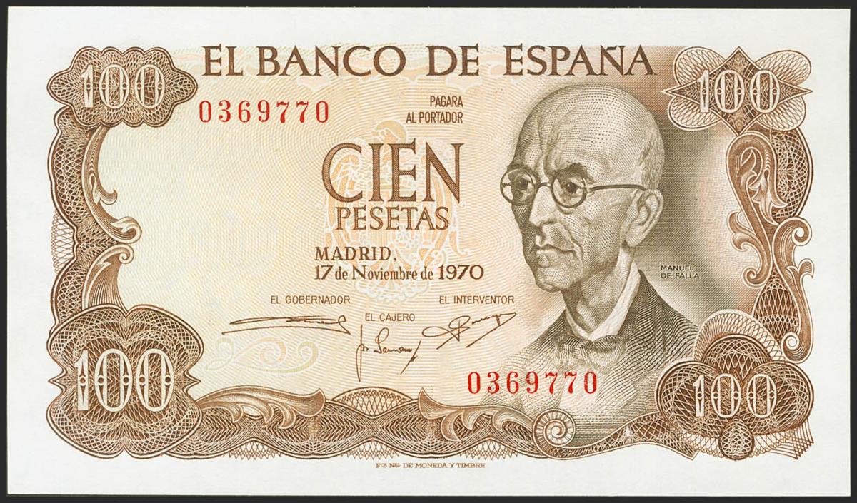 100 Pesetas. 17 de Noviembre de 1970. Sin serie. (Edifil 2021: 472). Conserva todo su apresto original. SC.