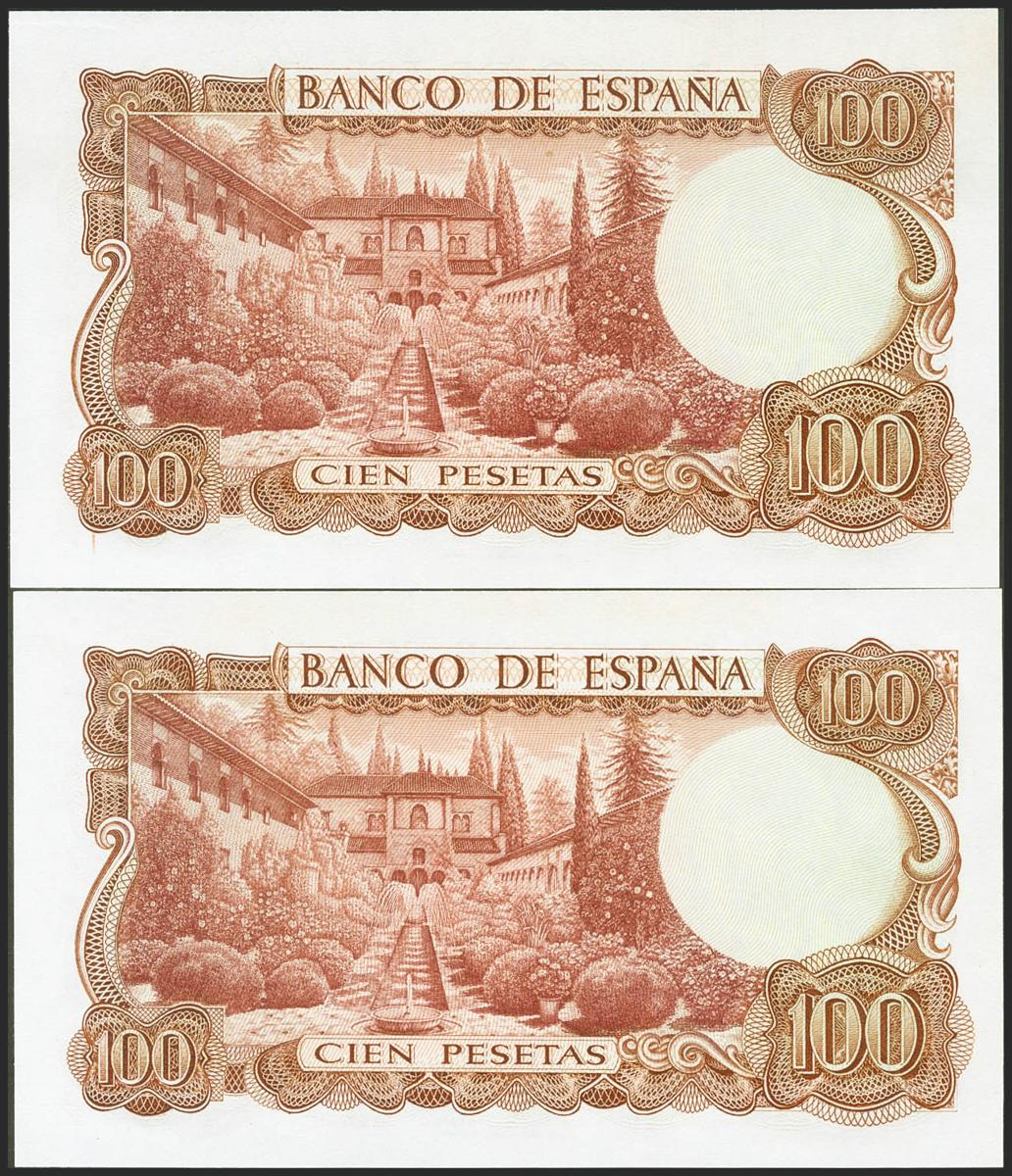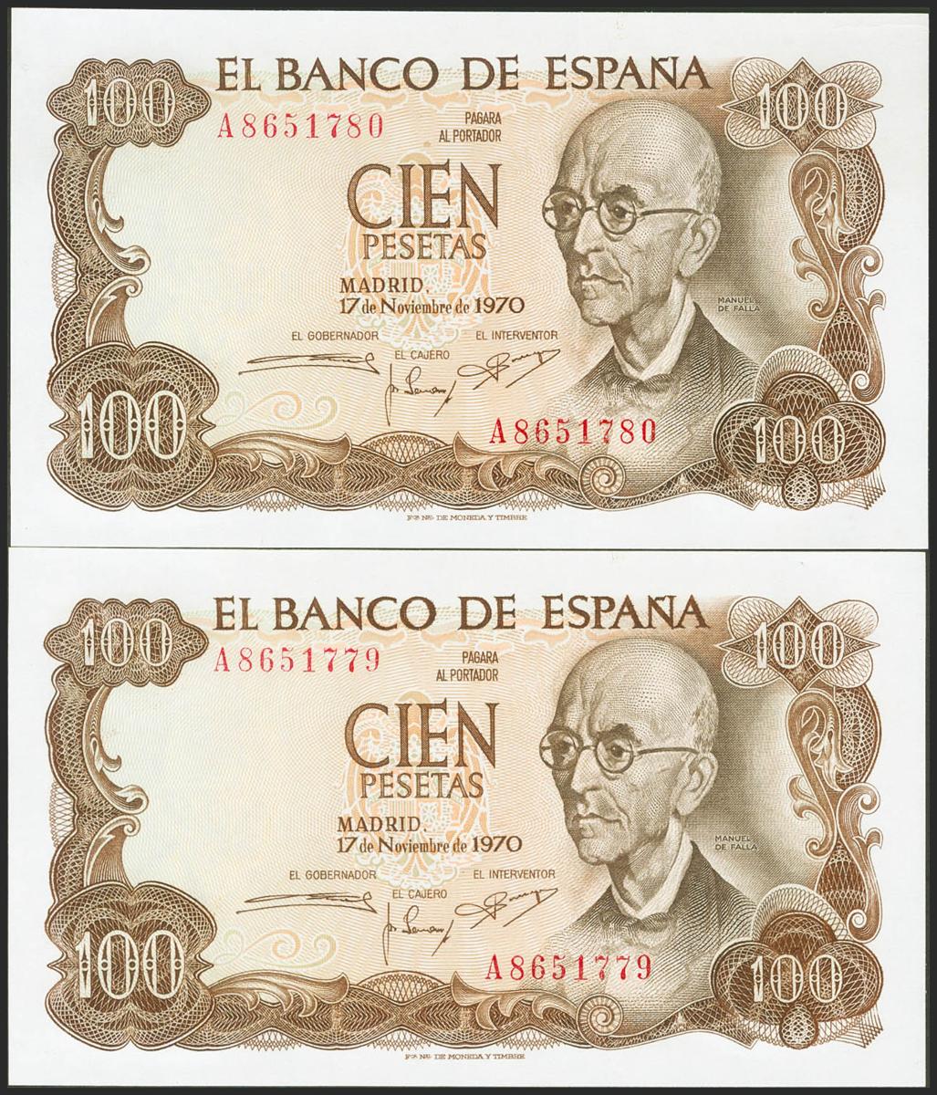 100 Pesetas. 17 de Noviembre de 1970. Pareja correlativa. Serie A. (Edifil 2017: 472a). Conserva todo su apresto original. SC.