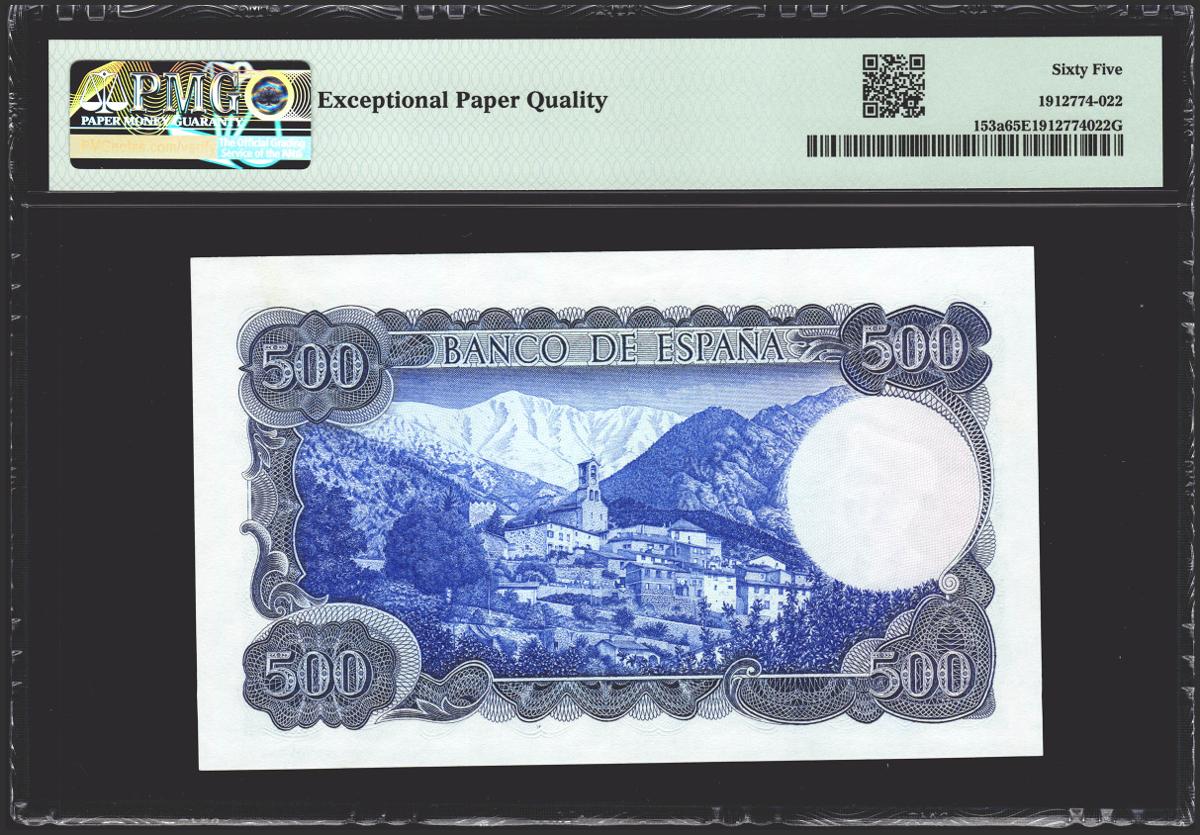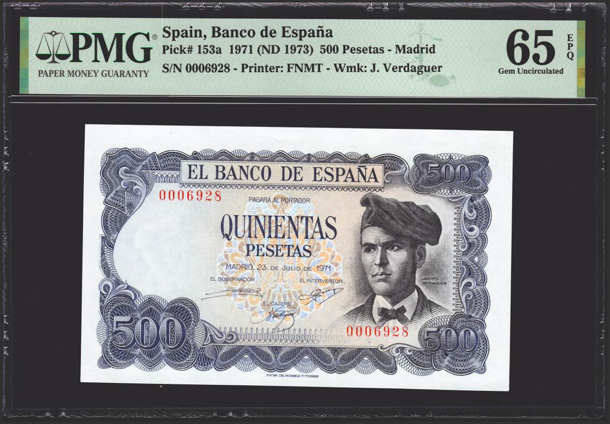 500 Pesetas. 23 de Julio de 1971. Sin serie y numeración bajísima. (Edifil 2021: 473, Pick: 153a). Inusual en esta calidad, apresto original. Encapsulado PMG65EPQ.