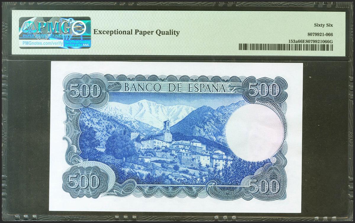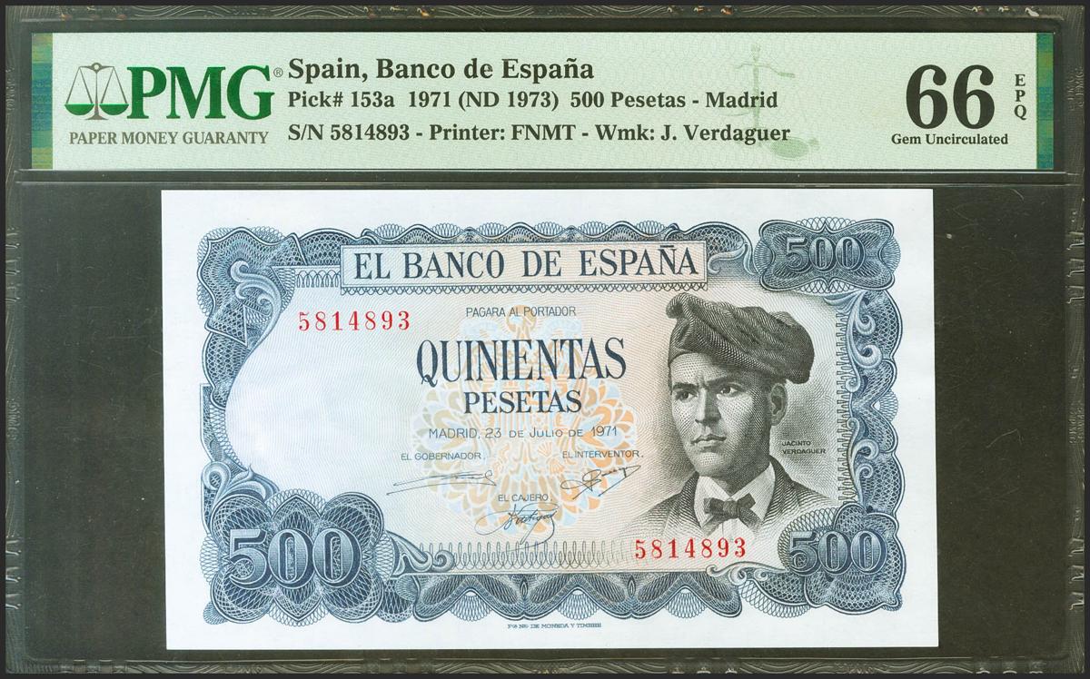 500 Pesetas. 23 de Julio de 1971. Sin serie. (Edifil 2021: 473, Pick: 153a). Raro en esta excepcional calidad, apresto original. SC. Encapsulado PMG66EPQ.