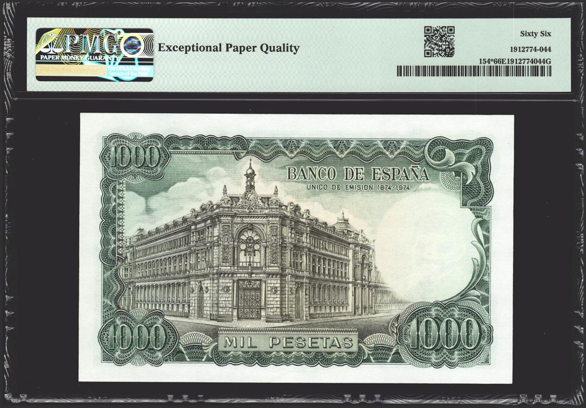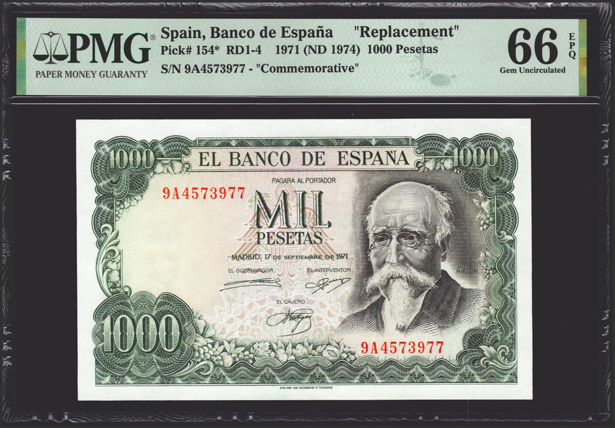 1000 Pesetas. 17 de Septiembre de 1971. Serie especial 9A. (Edifil 2021: 474d, Pick: 154*). Muy raro en esta excepcional calidad, apresto original. SC. Encapsulado PMG66EPQ.