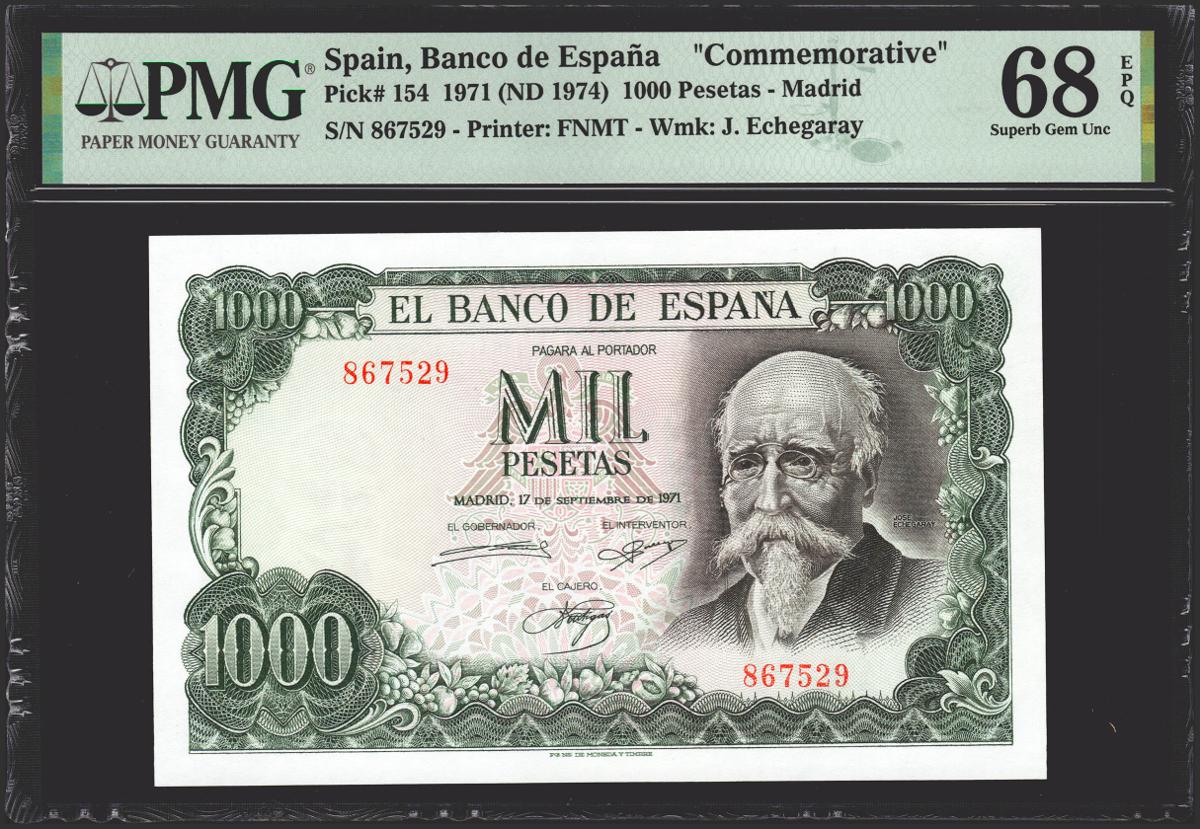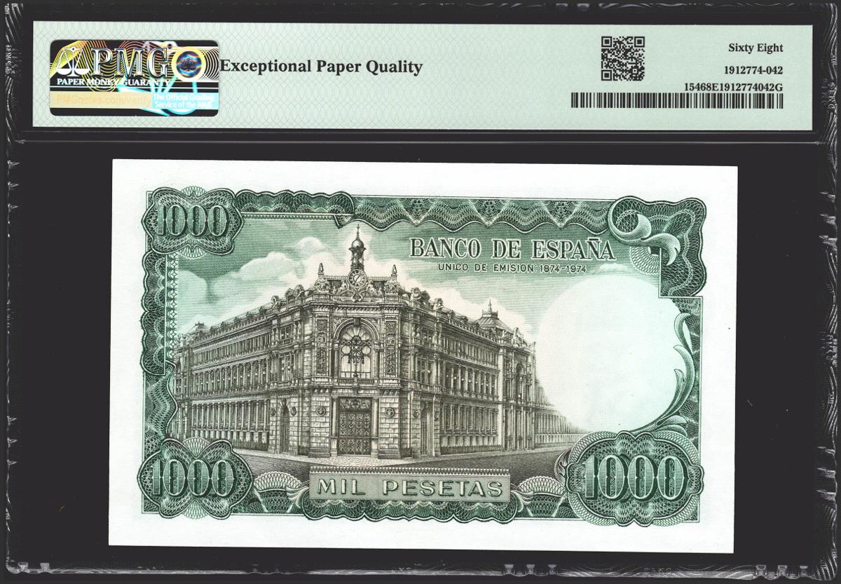 1000 Pesetas. 17 de Septiembre de 1971. Sin serie. (Edifil 2021: 474, Pick: 154). Muy raro en esta excepcional calidad, apresto original. SC. Encapsulado PMG68EPQ.