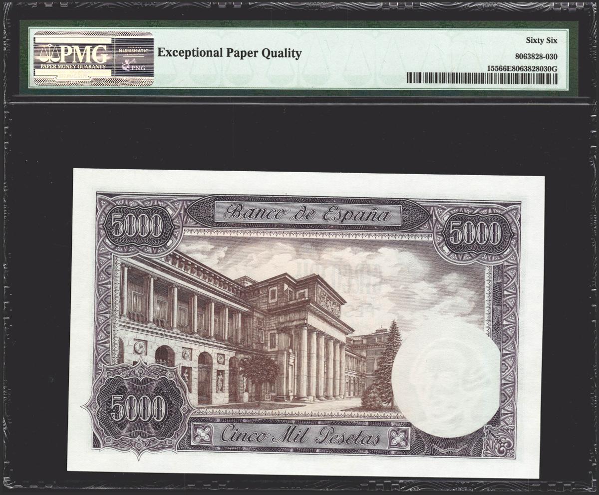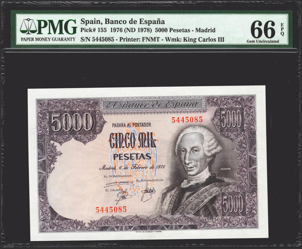 5000 Pesetas. 6 de Febrero de 1976. Sin serie. (Edifil 2021: 475, Pick: 155). Inusual en esta excepcional calidad, apresto original. SC. Encapsulado PMG66EPQ.
