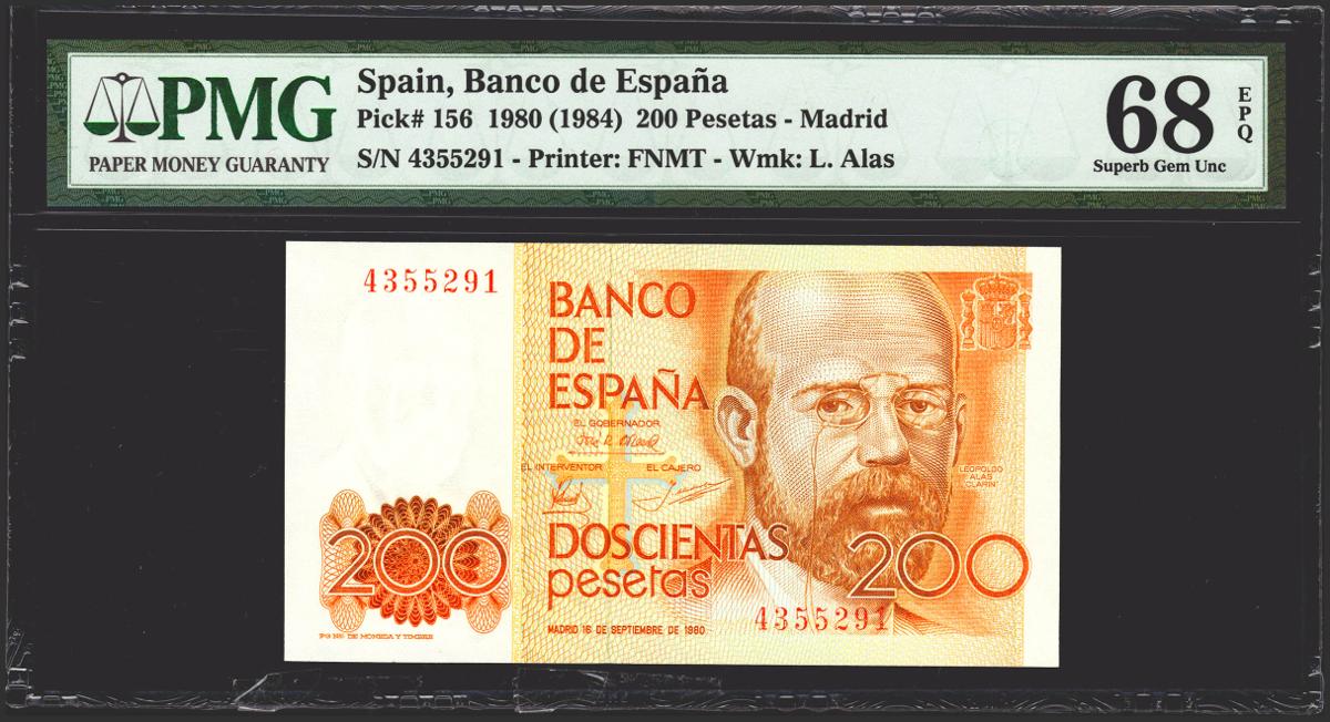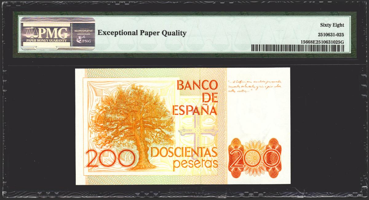200 Pesetas. 16 de Septiembre de 1980. Sin serie. (Edifil 2021: 480, Pick: 156). Rarísimo, especialmente en esta excepcional calidad. SC. Encapsulado PMG68EPQ.